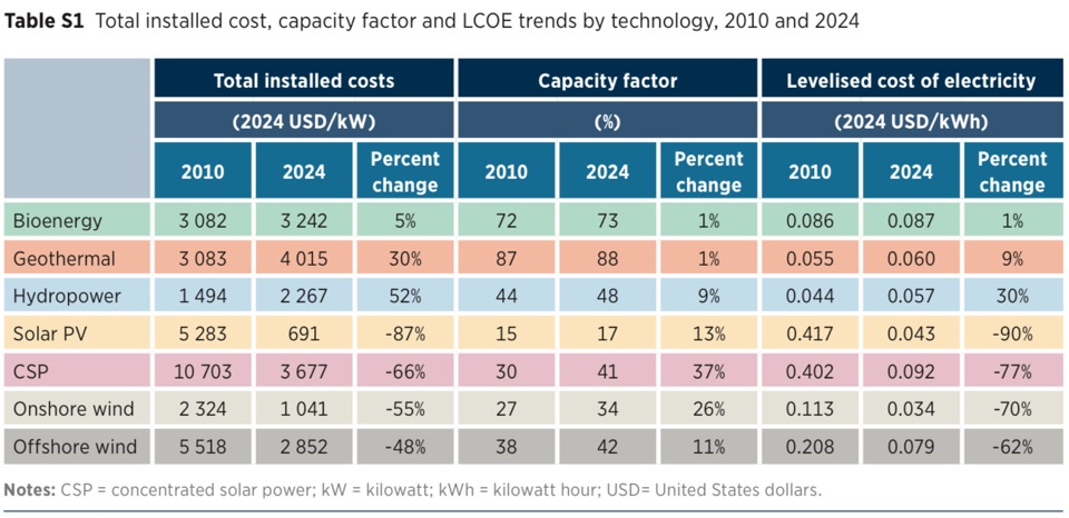 Hisobotda qayd etilishicha, 2024-yilda yerusti shamol elektr stansiyalari eng arzon elektr manbai bo‘lib qoldi. Ularning o‘rtacha LCOE ko‘rsatkichi 1 kilovatt-soat uchun 0,034 AQSH dollarini tashkil etdi. Ikkinchi o‘rinda quyosh fotoelektrik stansiyalari (0,043 dollar/kVt⋅soat), uchinchi o‘rinda esa GES (0,057 dollar/kVt⋅soat) joylashgan. Ba’zi mamlakatlarda bu narxlar yanada past: Xitoyda yerusti shamol energetikasi uchun o‘rtacha narx 0,029 dollar/kVt⋅soatni, Braziliyada esa 0,030 dollarni tashkil etgan. Quyosh energetikasida Xitoyda LCOE 0,033 dollar, Hindistonda esa 0,038 dollar bo‘lgan.
