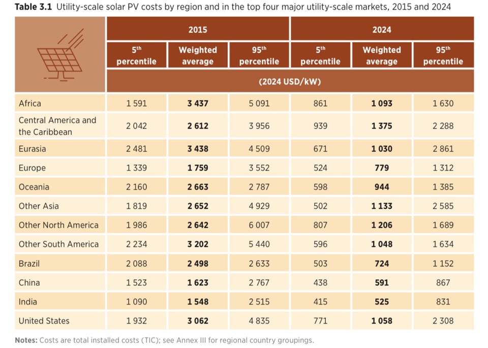 Quyosh energetikasi bo‘yicha o‘rtacha kapital xarajatlar (CAPEX — ya’ni qurilish xarajatlari) 2024-yilda 1 kVt quvvat uchun 691 AQSH dollarini tashkil etdi, bu esa 2023-yildagi 776 dollardan past. Eng past kapital xarajatlar Hindistonda (525 dollar/kVt) va Xitoyda (591 dollar/kVt) kuzatildi, AQSHda esa bu ko‘rsatkich deyarli ikki baravar yuqori bo‘lgan.